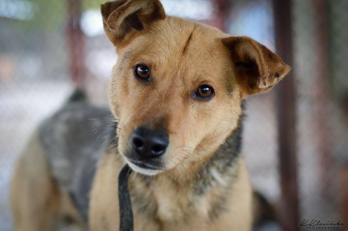 Aron to około 4-5 letni, średniej wielkości pies. Trafił do schroniska z okolicznej wioski, gdzie został znaleziony. Na sobie miał długi kawałek łańcucha i rozcięte ucho. Jaki były jego losy? Niestety nie wiemy.