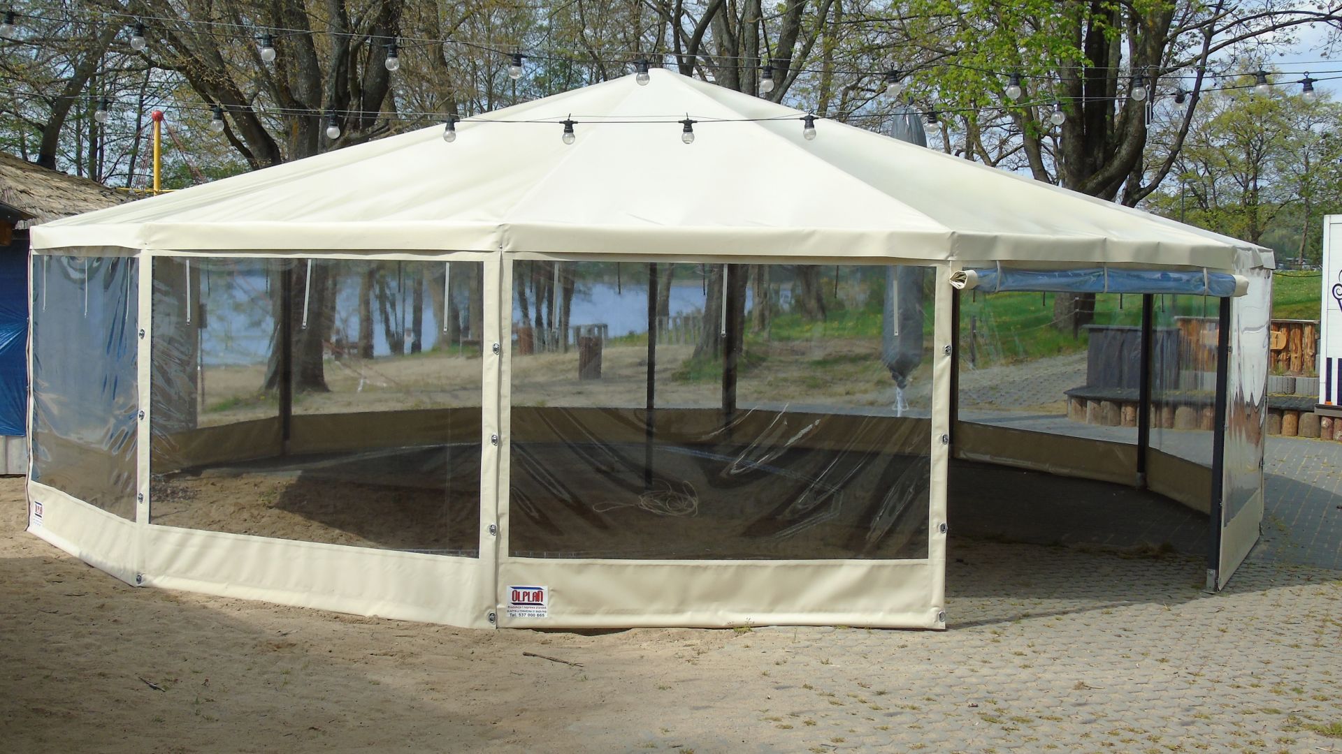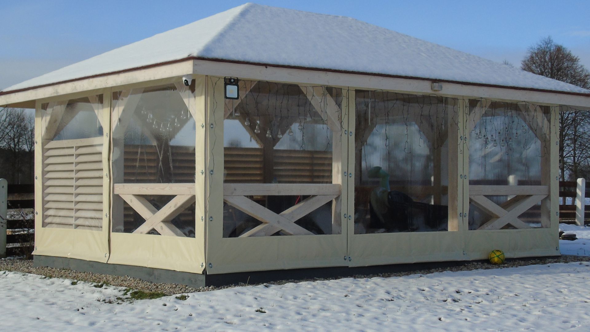 W produkcji stosujemy materiał MEHLER o gramaturze 680 g/m², przeznaczony do zastosowań zewnętrznych, odporny na działanie wilgoci, promieniowania UV oraz zmiennych temperatur. W osłonach wykorzystujemy również folię transparentną z atestem niepalnym, która zapewnia dostęp światła przy zachowaniu bezpieczeństwa.