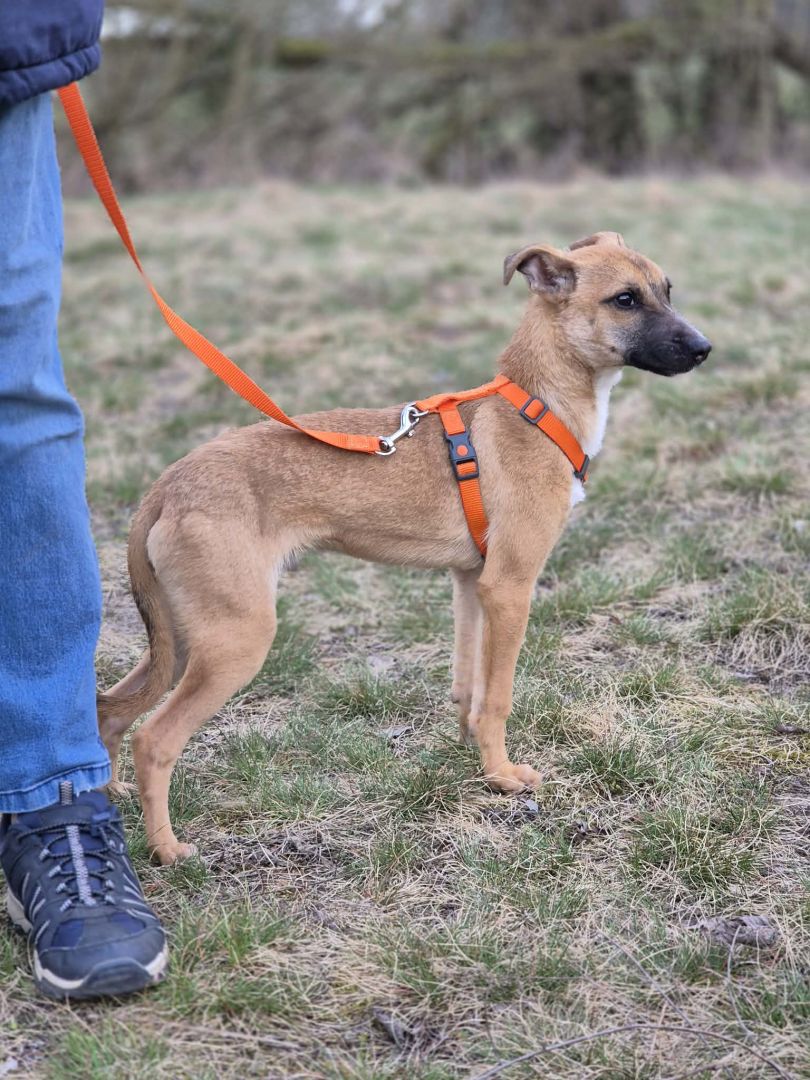 Ma prawie pół roku. Sięga pod kolano. Waży prawie 6 kg. Większy nie urośnie. Figura sarenki :)