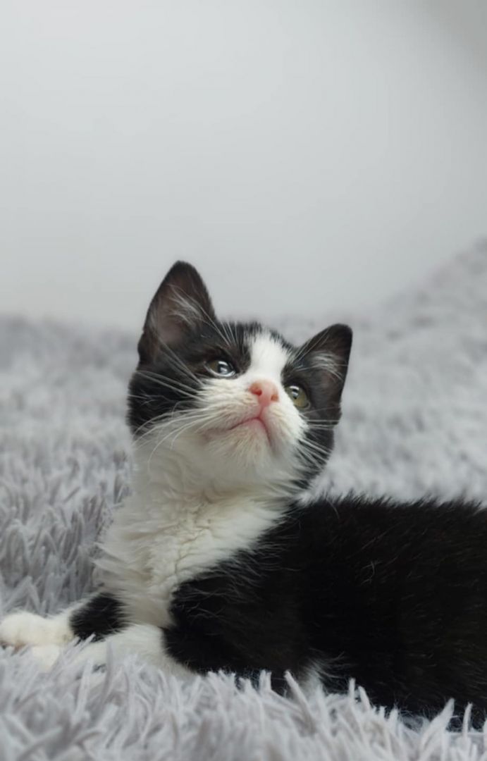 Obecnie przebywa w domu tymczasowym u jednej z naszych pracownic, tam uczy się kociego życia i… idzie mu doskonale!
